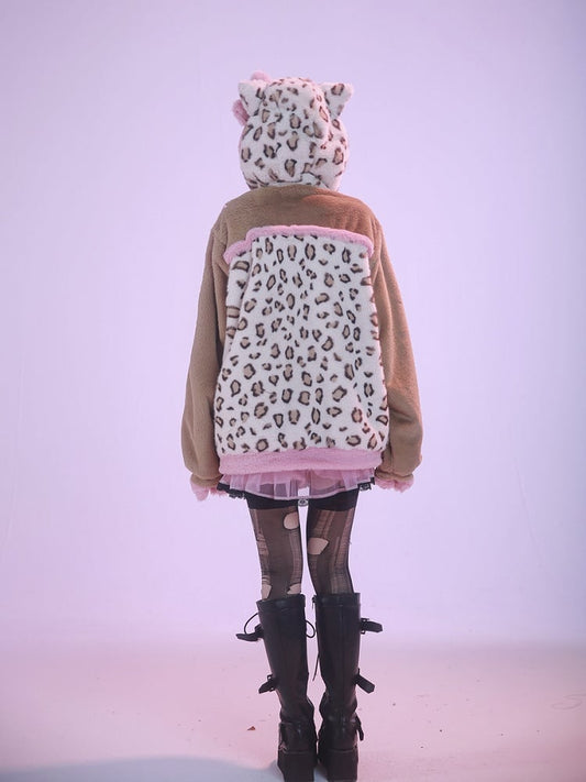 Brown and Pink Leopard Kitty Ears Hooded Plush Jacket