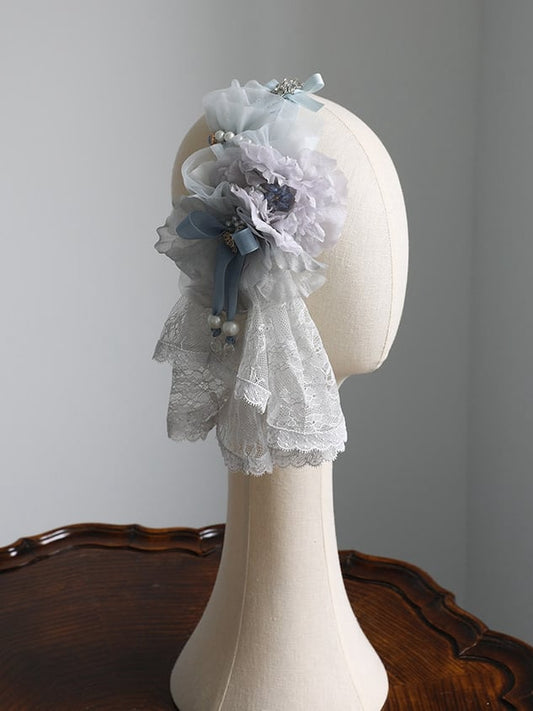 Tulle Lace-Trimmed Bow Blue Lolita Hairband with Beige