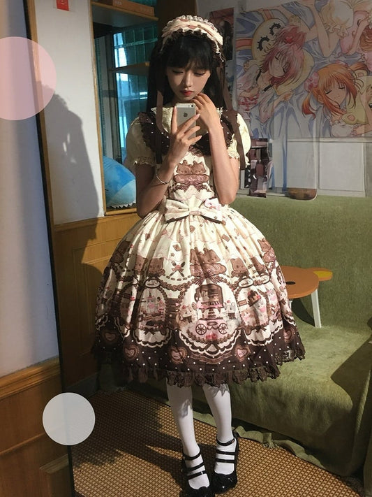 Brown Decorated Lolita Bear Bow with Print Lace-Trimming Hat