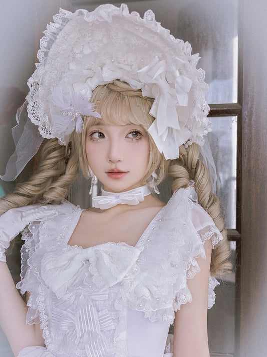 Trimmed Accents Lolita Bow Lace White with Bonnet