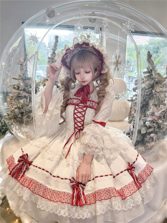White and Wine Red Bow Accent Bonnet Lace Trim