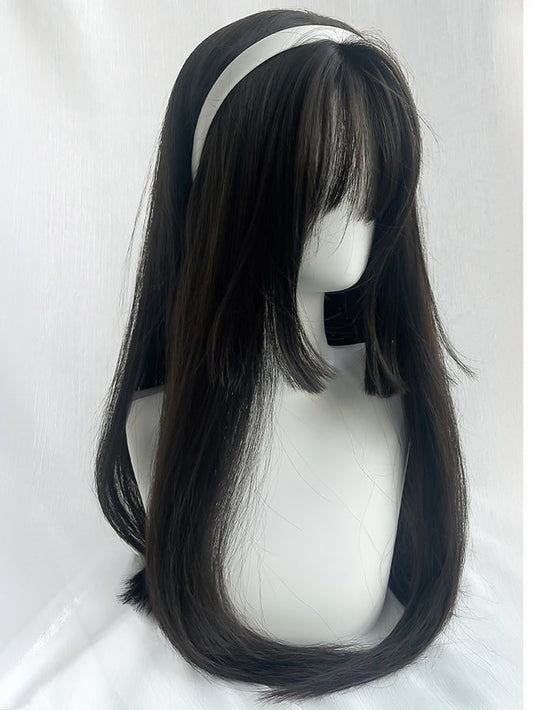 Brown/Black Long Straight Hime Cut Synthetic Wig With Bangs