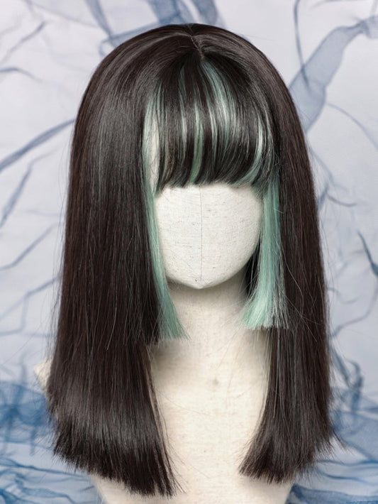 Y2K Black Mint Green Highlight Straight Hime Cut Synthetic Wig