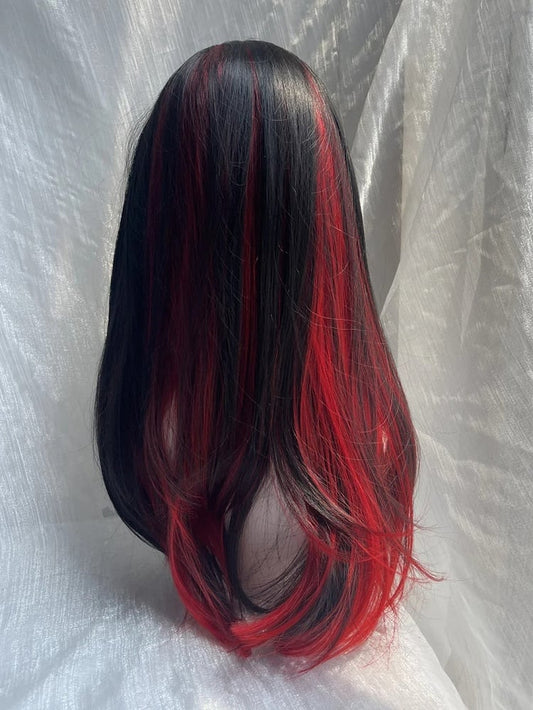 Black Red Highlight Hime Cut Long Straight Halloween Synthetic Wig