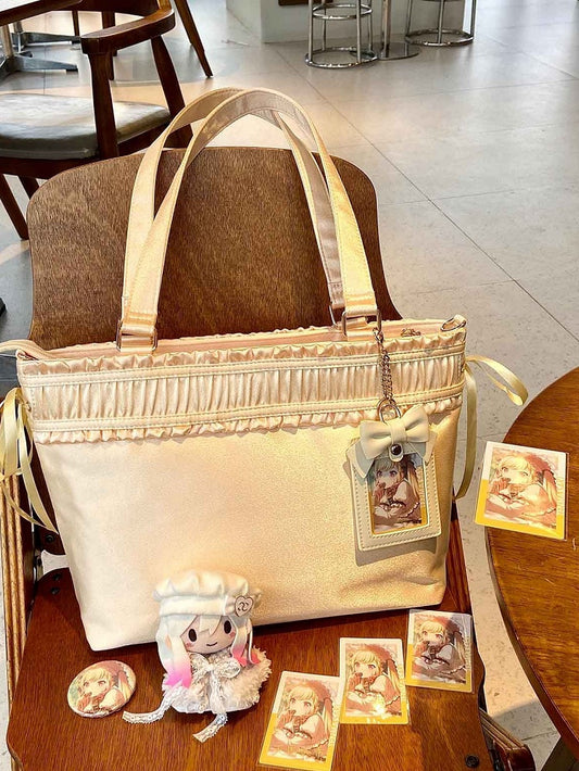 Ruffled Trim Ita Bag Ribbon Bow Large White Capacity Tote