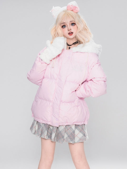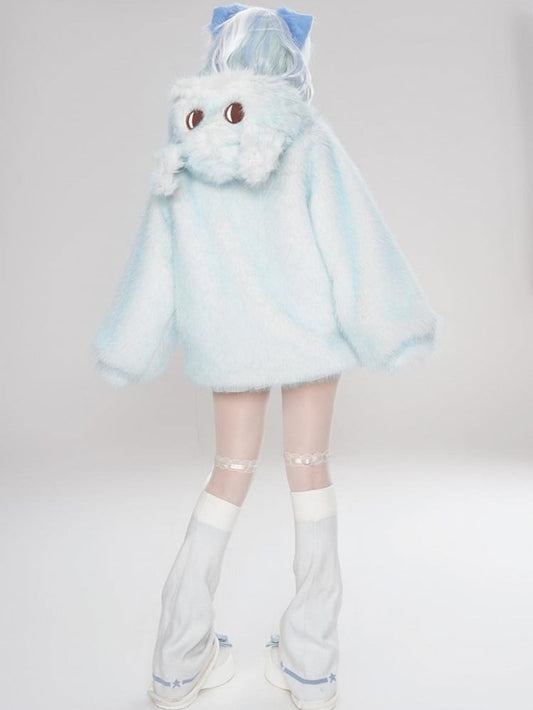 White/Pink/Light Blue Kitty Plush Hood Hooded Thick Jacket