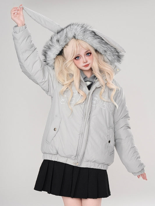 Grey/Apricot Letters Print Bunny Ears Hooded Thick Jacket Detachable Hood