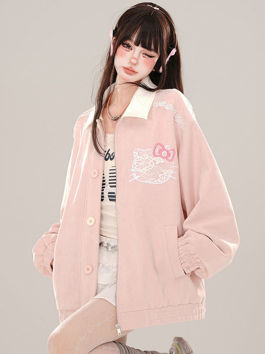 Pink Kitty Print Detachable Sailor Collar Thick Jacket