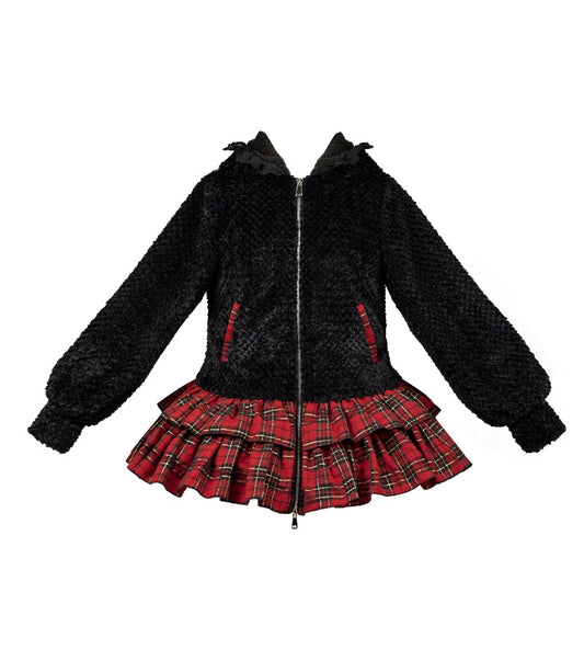 Black Kitty Ears Hooded Plush Jacket Bodice and Red Plaid Skirt Hem Zip Placket Dress