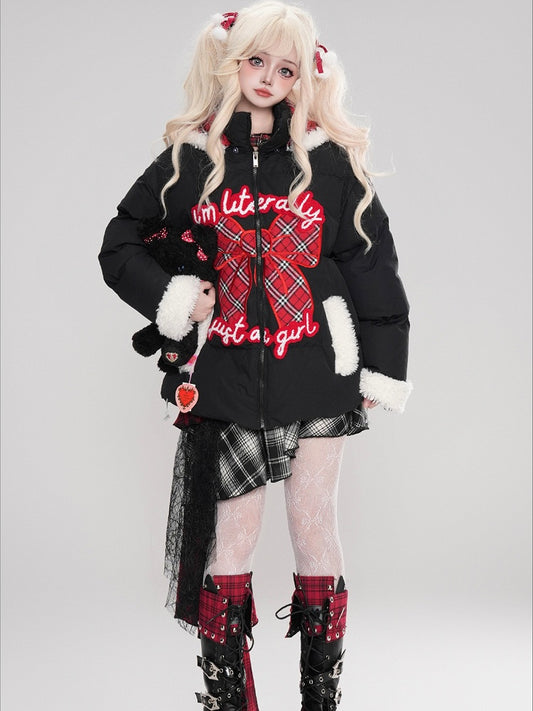 Black/White Paid Bowknot Applique Hooded Puffer Jacket Plush Cuffs