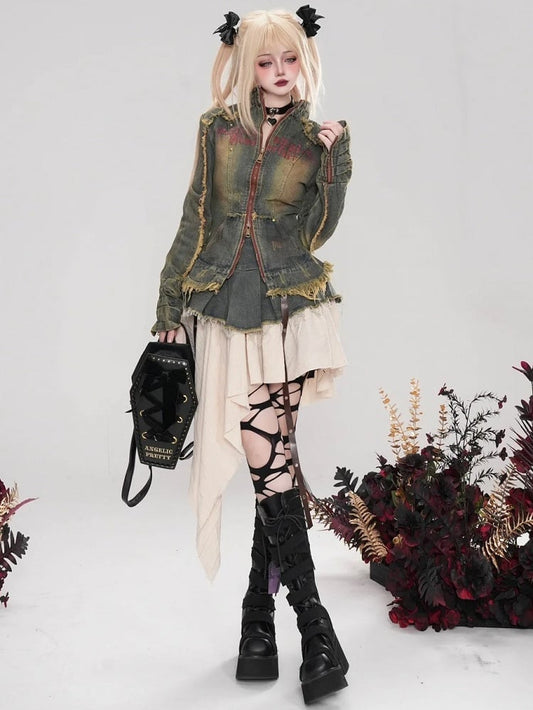 Punk Grey Letters Print Distress Trim Slim-fit Denim Jacket