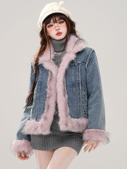 Pink/Camel Polo Collar Plush Trim Thick Jacket