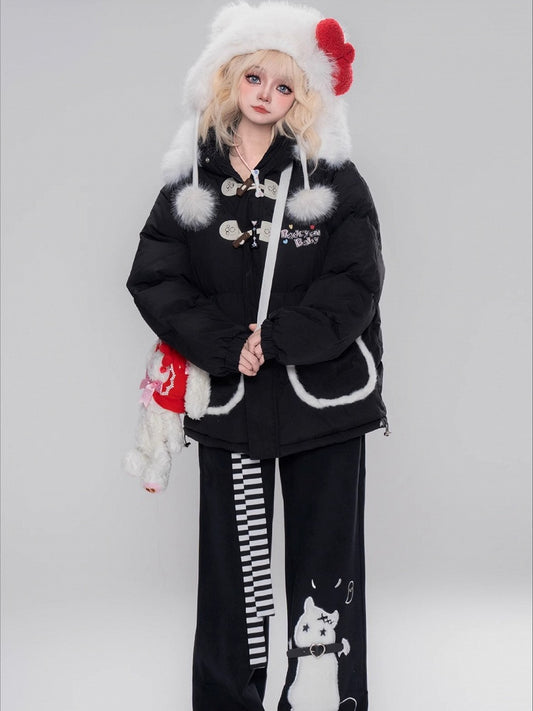 Black/Pink Letters Cat Ears Design Hooded Puffer Jacket