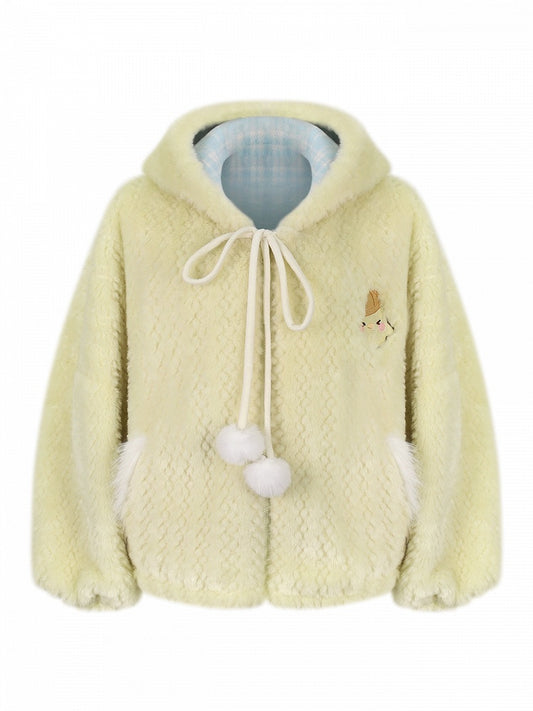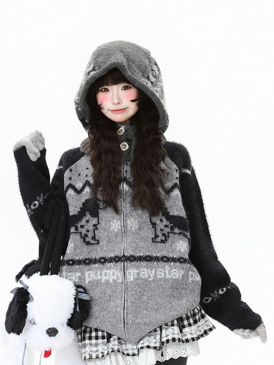 Faux Letter Jirai with Collar Embroidery Knit Jacket Kei Hooded Beige Fur