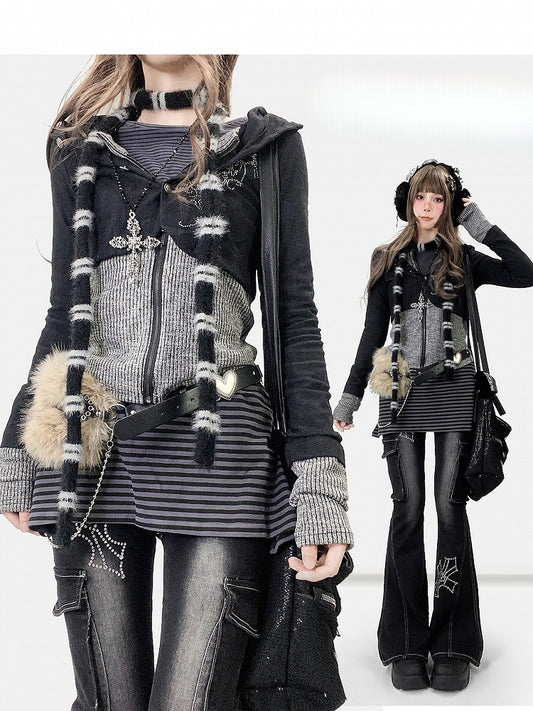 Jirai Letter Knit Black Hooded Jacket Collar Embroidery Fur Kei Faux with