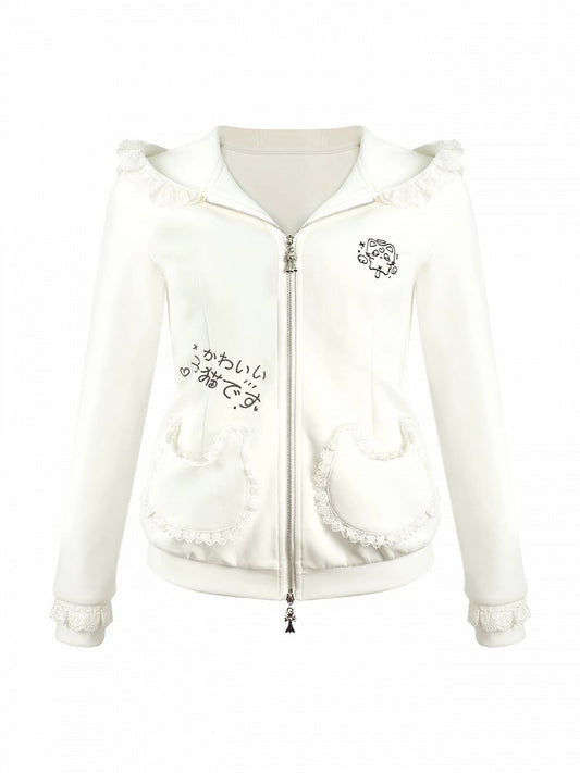 Otaku Embroidery White Hooded Jacket Moe - Gray Kitten