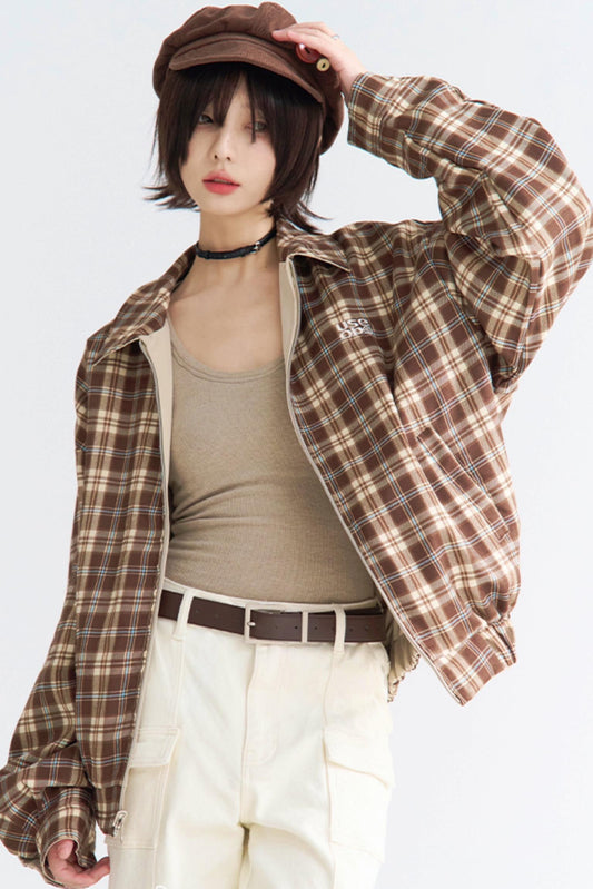 Fleece-Lined Hoodie Jacket Red Y2K Oversized Plaid Pattern Rose
