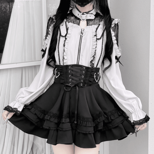 White - Shorts Gothic Black Landmine in Sailor Sleeve Lace-Threaded Bell Set Top Matching Style