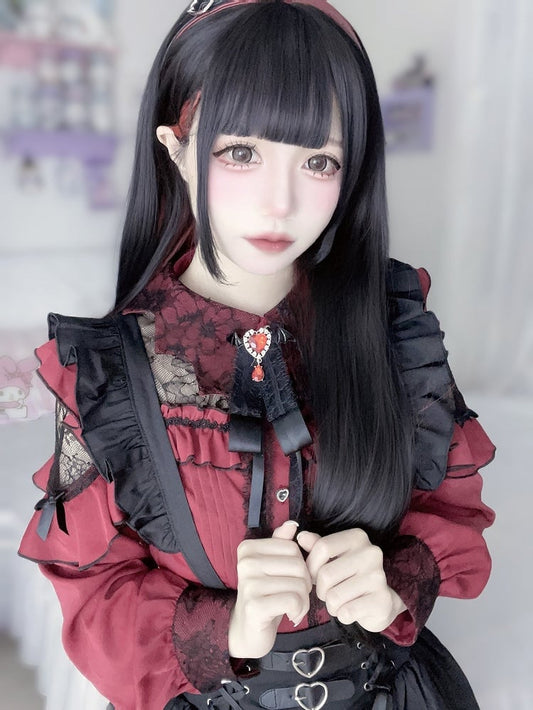 Jirai Kei Wine Red Bat Wing-shaped Collar Lace Patch Landmine Style Shirt
