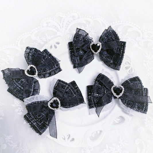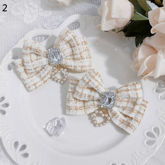 Jirai Kei Sweetheart Rhinestone Adorned Tweed Bowknot Hairclips