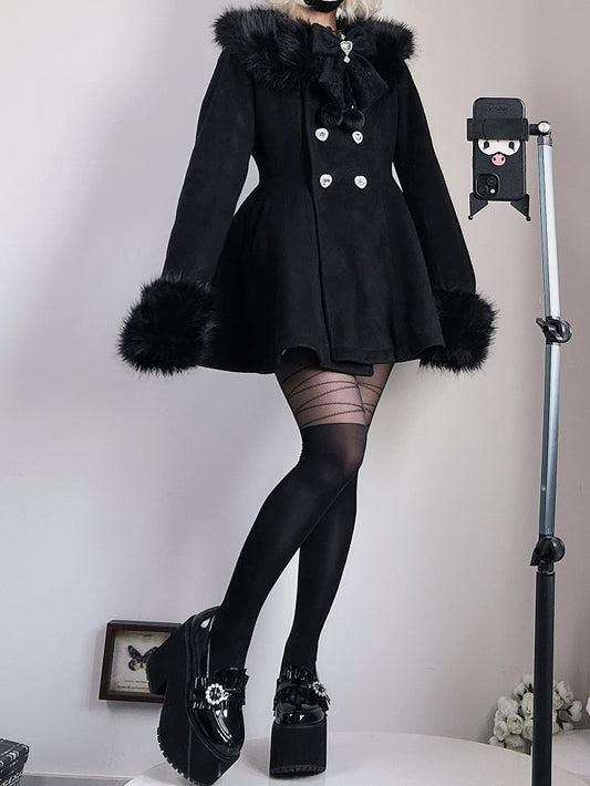 Jirai Kei Black Detachable Plush Collar and Cuffs Landmine Style Woolen Coat with Bow