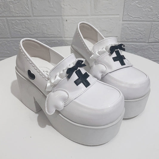 Jirai Kei White Yami Kawaii Cross Bowknot Platform Loafers
