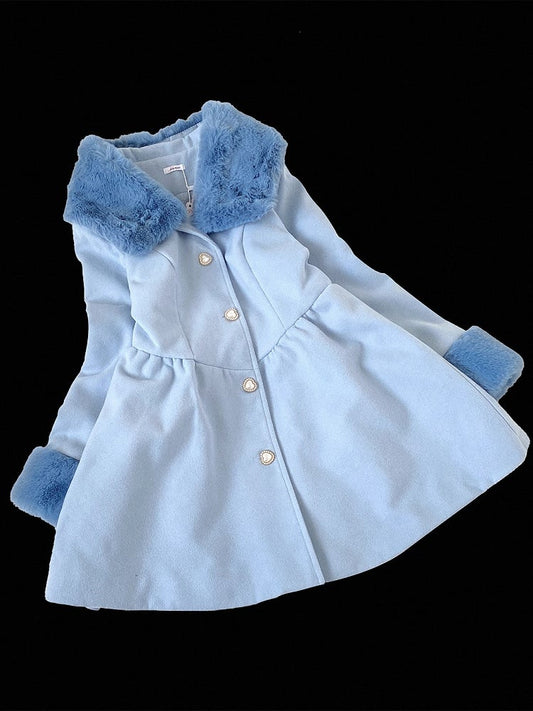 Jirai Kei Pink Landmine Style Woolen Coat with Plush Collar and Cuffs