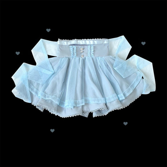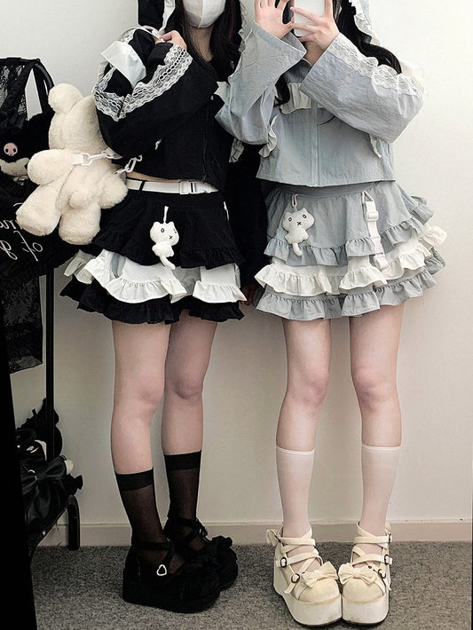Blue Jirai Kei Techwear Cute Kitty Adorned Tiered Ruffles Skirt