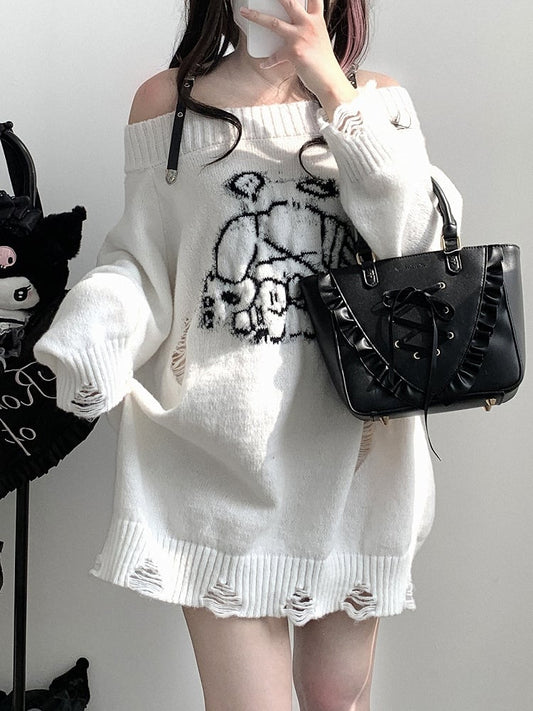 Jirai Kei Grey Angel Puppy Graphic Distressed Holes Landmine Loose Sweater