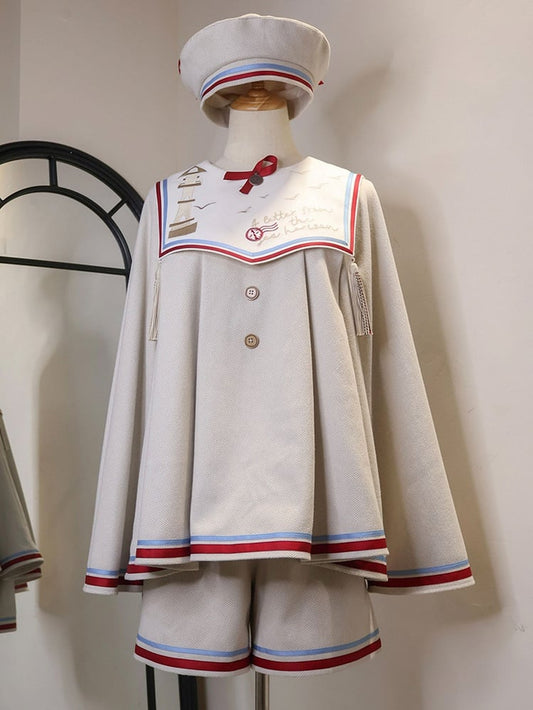 Beige Ouji Sailor Lolita Full Set-Beige Sailor Collor Top + Beige Ouji Shorts + Beige Beret Hat