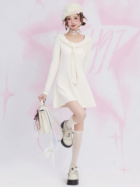 Top Sailor Flared Ribbon Cake + Puff Neck + Sleeve Skirt Waist