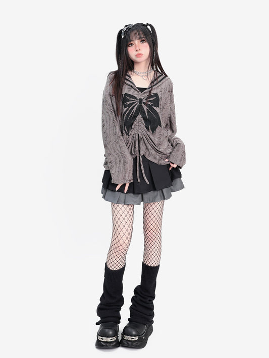 Gothic White Sailor Collar Shirt+Gray Lace Trim Striped Skirt+A Black Bow Jirai Kei Set