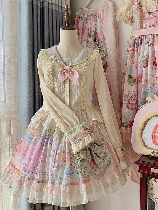 Sailor Flared + Skirt Waist Puff Ribbon Cake Top + Sleeve Neck
