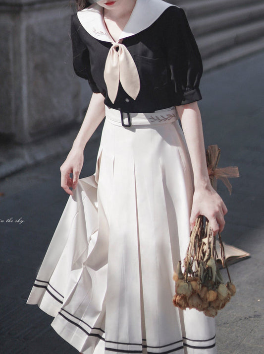 Pleated Bunny Elegant Tie + Retro Ear Puff French Sleeve Box Sailor Shirt + Skirt Collar