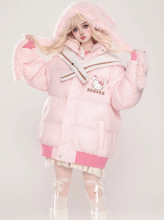Pink Kitty Print Detachable Sailor Collar Thick Jacket