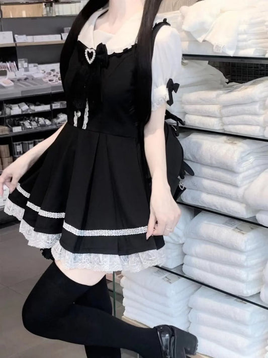 Black JiraiKei Two-Piece Set Sailor Collor Blouse High Waist Lace Trim Overall Dress