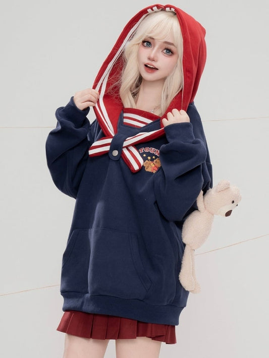 Light Yellow/White/Navy Blue Cute Bear Plushie Adorned Sailor Collar Hoodie
