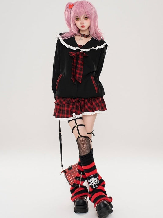 Y2K Black Sailor Collar Top with Red Plaid Tiered Skirt Set