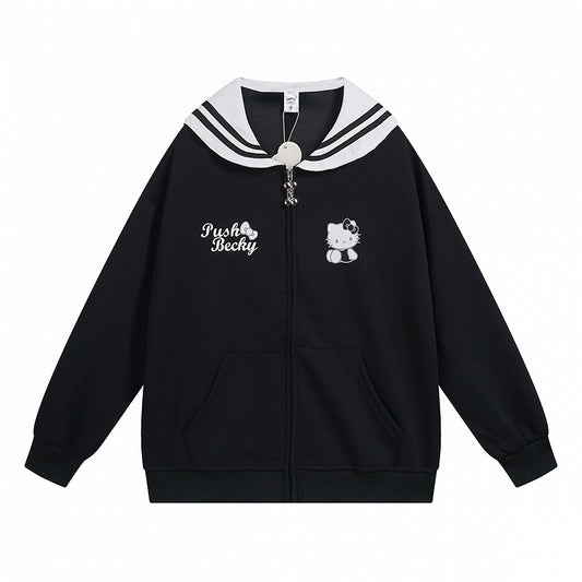 Pink/Light Blue/Grey/Black Kitty Print Sailor Collar Zip Closure Thick Sweatshirt