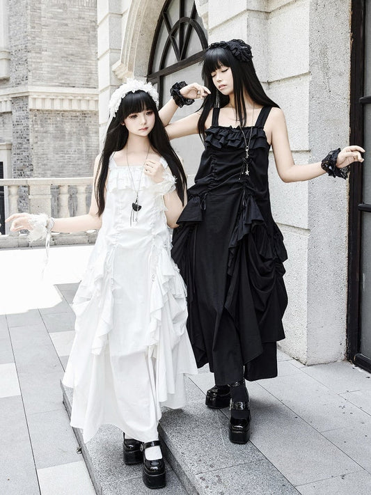 + Drawstring Design Necklace White Goth Ruffles Loose Scarf Dress Cascading