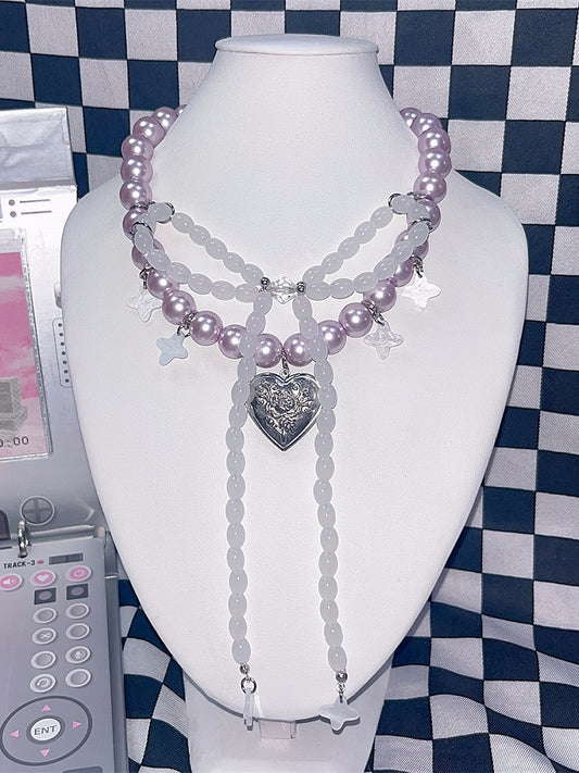 Bowknot Purple Design Beaded Y2K Pendant Heart Necklace