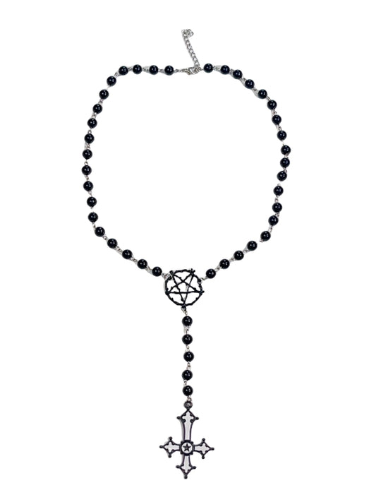 And Cross Beaded Pendant Necklace Black Pentagram