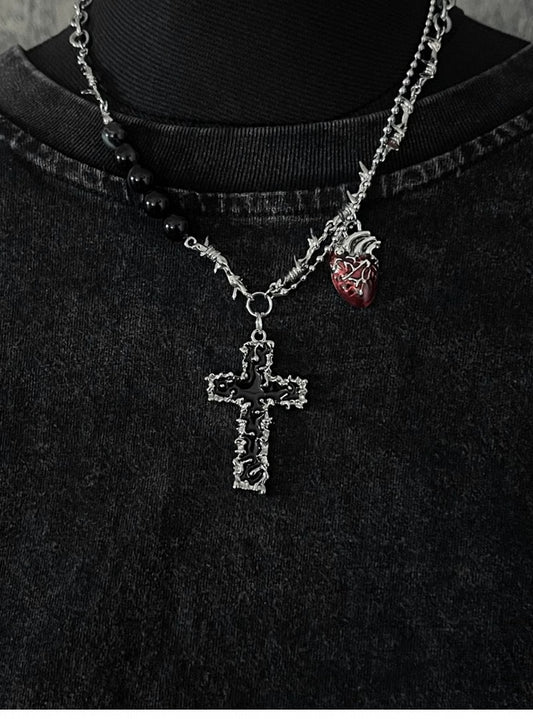 Silver Crossand Heart Pendant Thorn Necklace