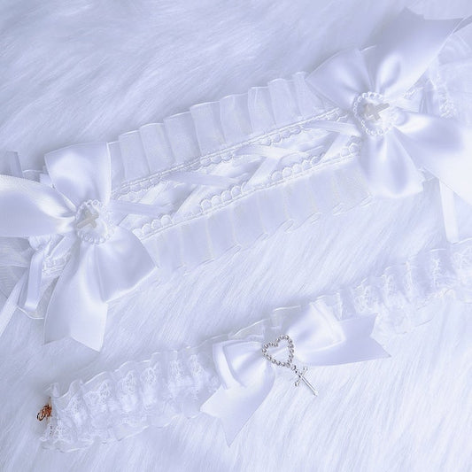 Pink/Blue/White Jirai Kei Cross Adorned Lace Trim Bowknot Hairband/Necklace/Wristcuff