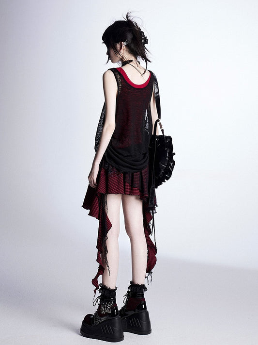 Tank Cross Black Print Red Adjustable with Drawstrings Top Semi-Sheer