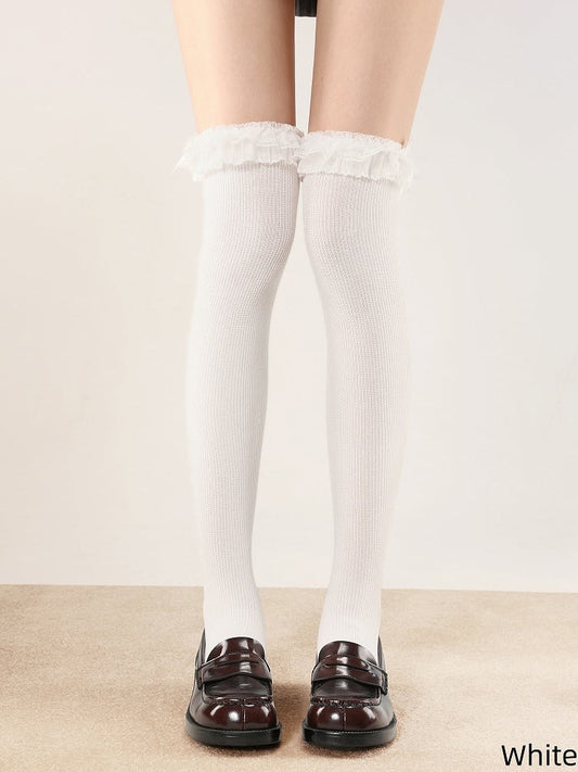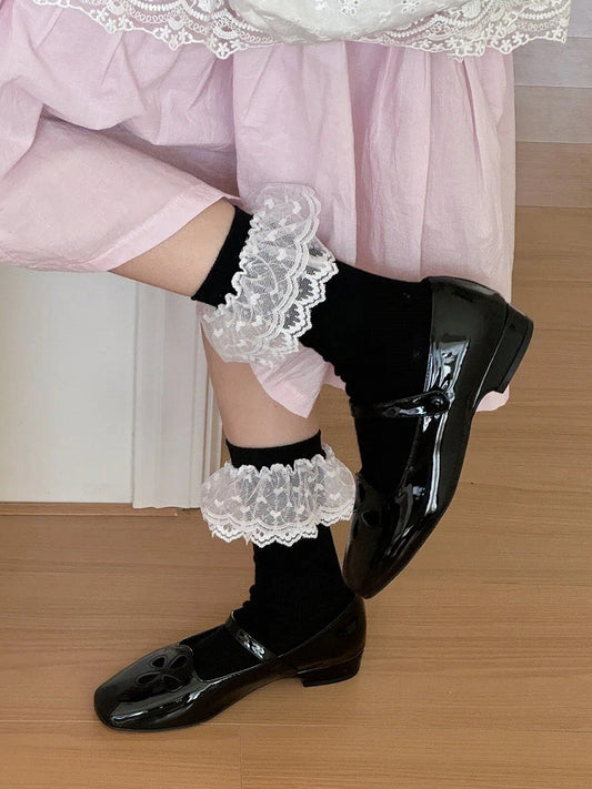 Stockings Calf-Length Cuffs Ruffled Lace with Ribbed