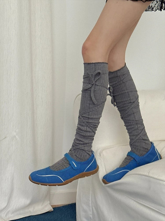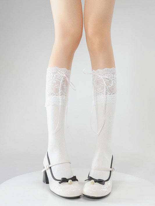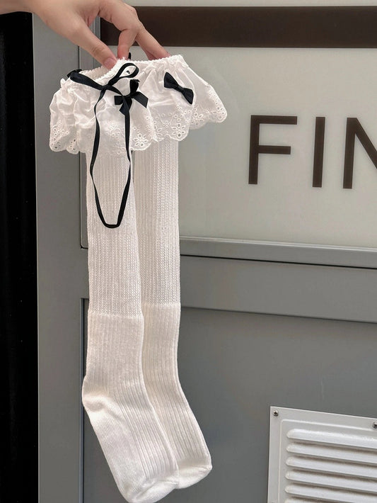 Bow Ribbed Lace Stockings Ruffled with