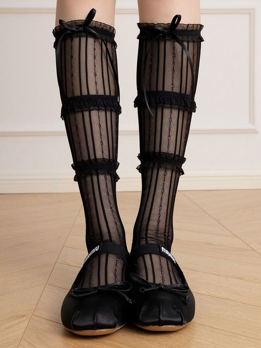 White/Gray/Black Bow Calf Socks Vertical with Decoration Striped Mesh Pattern
