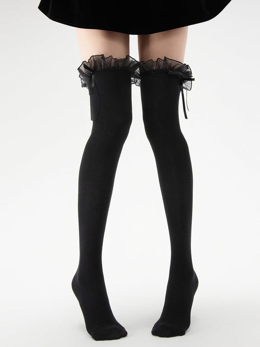 Creamy Multi-Layer Large White/White/Black Stockings Bow Ruffle Decoration Lolita Lace with