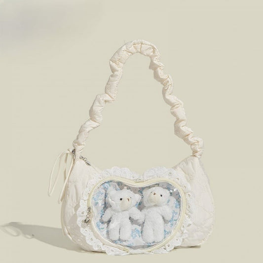 Y2K Aesthetic White Furry Shoulder Bag with Vintage Cat Patches